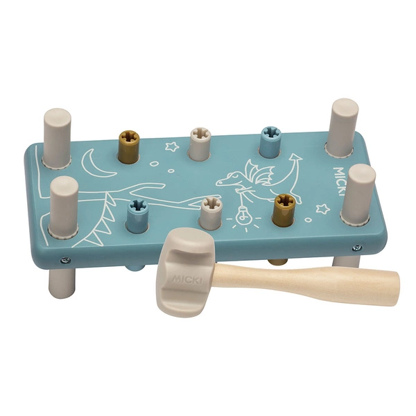 Drewniana przebijanka z gumowym młotkiem niebieska, wbijanka, zabawka Micki