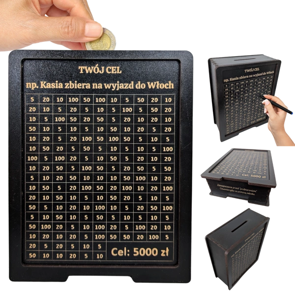Skarbonka do wykreślania z szybką. Pełna personalizacja. Tracker